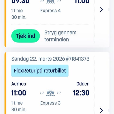 Søger Molslinjen bil billet søndag 29/3 Aarhus-Sj. Odde og retur Sj. Odde-Aarhus 29-30/3