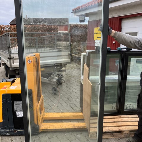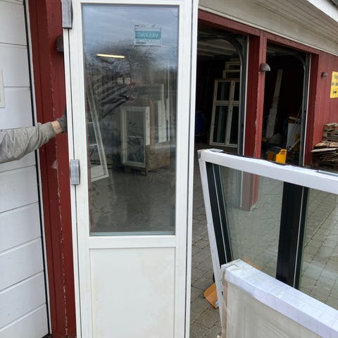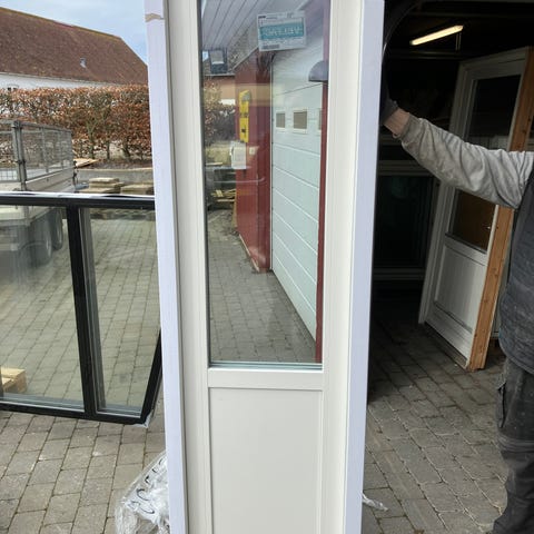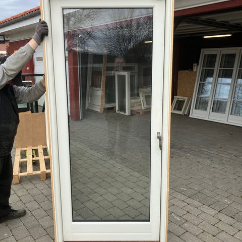 ny dør har været monteret 1 md karmmål er 95,7 x 235 cm åbner venstre ud træ/alu 3 lags energiglas egetræs bundstykke