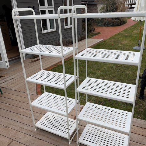 4 stk. hvide reoler i metal - sælges samlet. Pæne og velholdte, med brugsspor. Fleksibel opsætning af hylder.