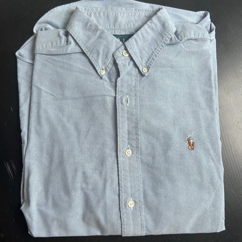 Ralph Lauren langærmet herrebluse i størrelse L. Blusen er grøn og fremstillet i bomuld. Klassisk rund hals og diskret logo på brystet. Velegnet som hverdagsbluse eller som let lag over en T-shirt.