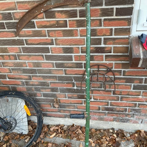 Orebo le med langt træskaft og metalblad. Redskabet har håndtag på skaftet for bedre greb. Egnet til arbejde i have eller på mark, f.eks. til slåning af græs eller ukrudt. Klassisk manuelt haveredskab i træ og metal.