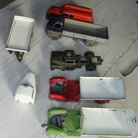 Min barndoms Tekno legetøjsbiler i metal i forskellige farver og størrelser. Modellerne omfatter blandt andet brandbiler med stige, ambulancer, lastbiler med lad og anhængere, ølkasser, mælkejunger og trækævler samt 2 taxaer. Flere af bilerne har slidte tryk og detaljer på siderne, og der medfølger enkelte løse dele som hjul og små tilbehørsdele. Ingen af bilerne kan klare et syn 😉. De fleste bærer præg af at være leget meget med og har forskellige mangler og defekter. Perfekt til samleren der kan sætte dem i stand og/eller om supplement til eksisterende samling af model- og legetøjsbiler.