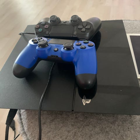 Sony Playstation 4 konsol i sort. Standard PS4-model med tilslutningsmuligheder som HDMI, USB-porte og netværksstik på bagsiden. Konsollen anvendes til spil, streaming og multimedieafspilning og understøtter trådløse controllere. Velegnet til brug med kompatible PS4-spil og tilslutning til tv eller skærm via HDMI.