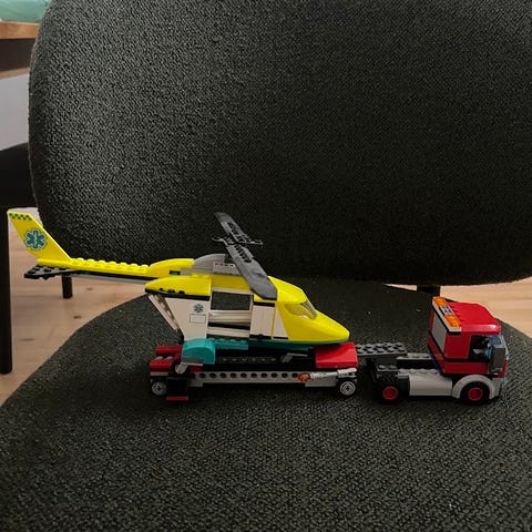 Til sættet hører oprindelig også en gul flugtbil, som ikke er med. Desuden er kæden der hænger ud af helikopteren en anden type. Manual findes ikke, men kan downloades fra nettet. Hvis det har interesse medfølger en alternativ flugtbil. Sælges derfor billigt