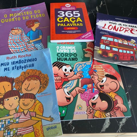 Blandet lot med børnebøger på portugisisk. Pakken indeholder blandt andet illustrerede historier og aktivitetsbog med ordjagt. Velegnet til børn, der læser eller lærer portugisisk, samt til højtlæsning. Alle bøger er trykte udgaver med farverige illustrationer.