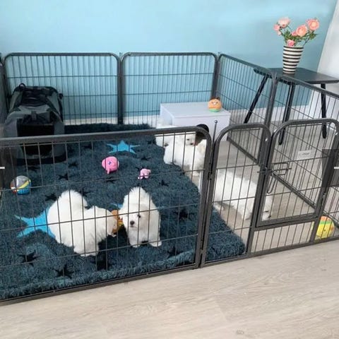 BabyDan/DogSpace Max hundegård i sort metal. Gitteret består af flere sektioner, herunder en sektion med låge, der kan åbnes for nem adgang. Farven er sort, og materialet er metal. Brugt til bomuldshund på 10 kg siden januar 2025.