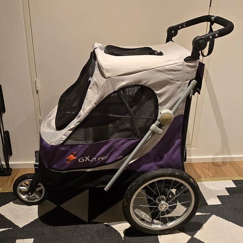 En Petstro Skyline klapvogn der er god at manøvrere. Der medfølger også et plade/trimmebord der kan sættes over vognen.
