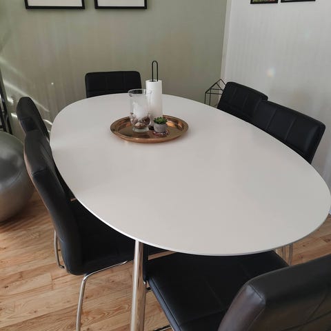 Bortgives......Har dette spisebord + 6 stole som egentlig var på vej til lossepladsen men tænkte det lige skulle have en chance hvis nogen kan bruge det. Det hele er massivt bøg og kan slibes ned og lysnes eller males. Stolene kan nemt ombetrækkes og tænker man stadig kan bruge skummet. Målet 157x 104 cm og der medfølger 2 tillægsplader
