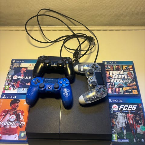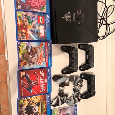 Sony Playstation 4 konsol med tilhørende DualShock 4 controller. Medfølgende kabler til strøm og tilslutning samt spillet LEGO Jurassic World på fysisk PS4-disk. Konsollen er egnet til spil, streaming og andre PS4-funktioner og kan tilsluttes tv eller skærm via HDMI.