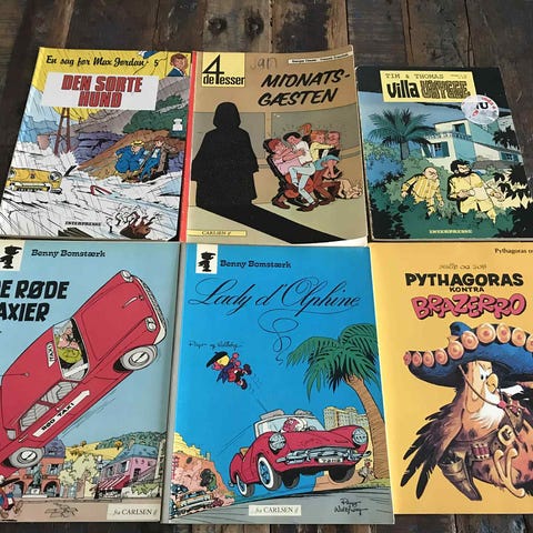 Blandet lot med danske tegneseriealbums. Lotten omfatter blandt andet titler som Far til fire, Ferd’nand, Gyldenspjæt, knold og Tot, Peter og Ping, Ole Bole ABC, Storm P mindealbum samt Petersens album. Flere af albummerne er fra 1940’erne og 1950’erne ifølge forsiderne. Tegneseriealbum i hæfte- og bogformat, velegnet til samlere af ældre danske tegneserier og klassiske figurer. Oplysninger om årstal og priser fremgår af sedlerne på billederne.