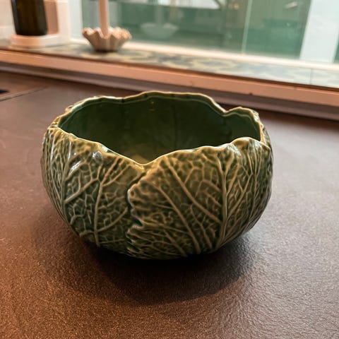 Bordallo Pinheiro porcelænsskål på fod i hvid. Skålen er rund med bølget kant og står på en massiv fod dekoreret med figurer og reliefmønstre. Fremstillet i Portugal. Velegnet som frugtskål, serveringsskål eller dekorationsskål i hjemmet. Målebilleder viser omtrentlige mål for højde og diameter.