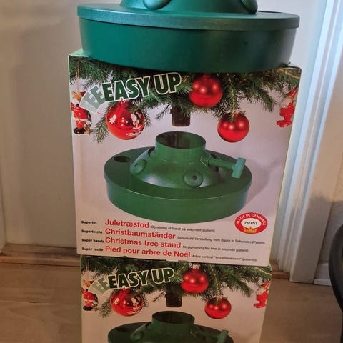 H&M Home juletræsfod i grøn plast med stjerneformede dekorationer på oversiden. Foden har et centralt hul til juletræsstammen og justerbare spændekløer, der fastholder træet. Der er integreret håndtag til spændemekanismen samt beholder i bunden til vand, så træet kan stå stabilt og få fugt. Velegnet til indendørs brug ved højtider som jul.