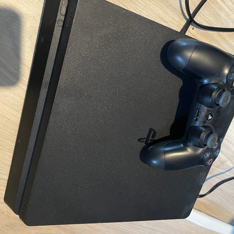 Sony PlayStation 4 konsol i sort. Standardmodel med tilslutning til tv via HDMI og strømtilslutning på bagsiden. Konsollen understøtter spil, streaming og multimedieafspilning via PlayStation 4-platformen. På billederne ses to DualShock 4-controllere, hvoraf den ene er blå og den anden sort. Yderligere specifikationer som lagerkapacitet og medfølgende tilbehør fremgår ikke af oplysningerne og bør afklares ved behov.