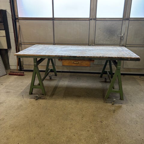 Mitsutomo arbejdsbord i rød metalramme med sort bordplade. Bordet har justerbare kæber og huller i pladen til fastspænding af emner. Velegnet som arbejdsstation til forskellige gør-det-selv- og håndværksopgaver i værksted eller garage. Har 2 stk a 100 kr
