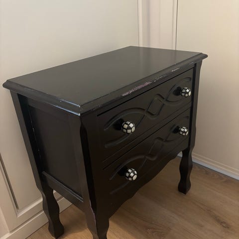 Hvid kommode med tre skuffer i trælook, ideel til opbevaring og med enkelt, moderne design. Perfekt til stuen eller soveværelset.,Bemærk at mail, chat og beskeder ikke besvares, og varen skal købes på knappen "Gå til varen"