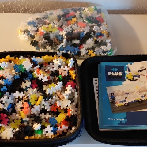 Kuffert med en masse plus-plus brikker, en plade og en lille "bog" med forslag til hvad man kan bygge.