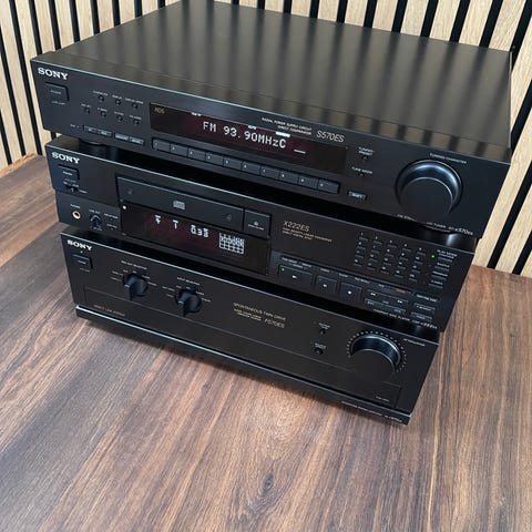 Sony stereanlæg med flere komponenter, herunder en forstærker, en CD-skifter.