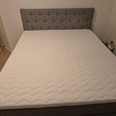 Ilva seng i grå polstret tekstil med træben. Sengen består af en polstret bund og madras med topmadras øverst. Stellet står på lyse træben, som giver god frihøjde under sengen til rengøring eller opbevaring.
