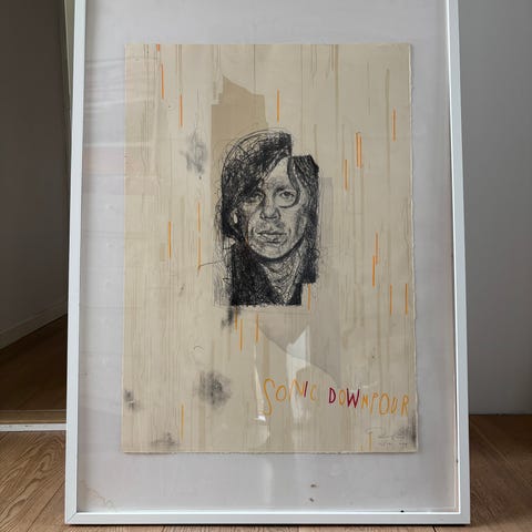 Originalt værk af Kasper Eistrup, collage med Pablo Escobar og Palme. Lille dedikation i højre hjørne
