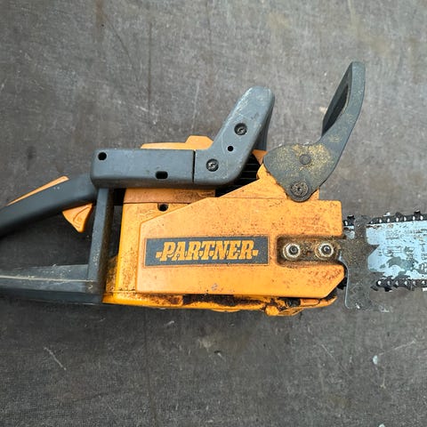 Partner P740 motorsav. Benzindrevet kædesav med for- og baghåndtag, kædebremse og startvejledning markeret på håndtaget. Velegnet til almindelige savopgaver i have og på mindre grunde. Modellen har plastkapsling i gul og sort og er udstyret med sværd og kæde monteret.