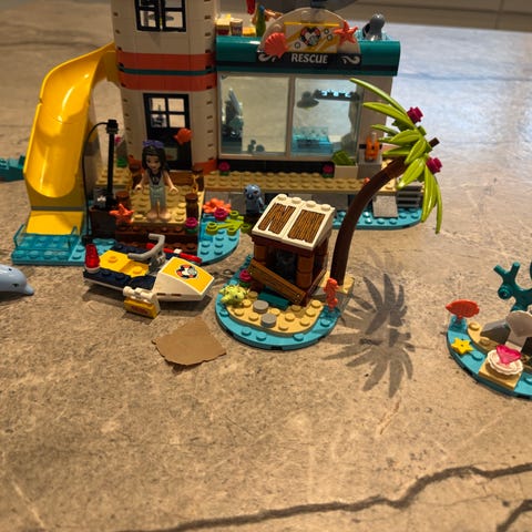 "Redningsmissionsbåd" fra Lego Friends (nr. 41381) i fin stand. Der mangler et skattekort og et instrument (se de to sidste billeder), ellers medfølger alle andre klodser, figurer og byggevejledninger.