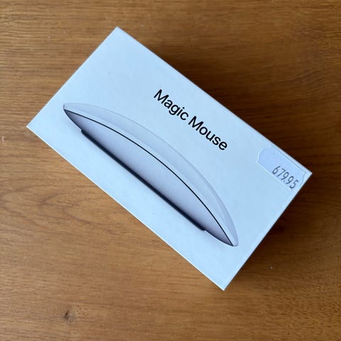 Apple Magic Mouse trådløs mus i hvid. Musen har berøringsfølsom overflade, som gør det muligt at scrolle og udføre enkle bevægelser direkte på musens top. Enheden er beregnet til brug med Apple-computere og andre kompatible enheder, der understøtter trådløs forbindelse til mus. Velegnet til almindeligt kontorarbejde, internetbrug og generel computerbetjening.