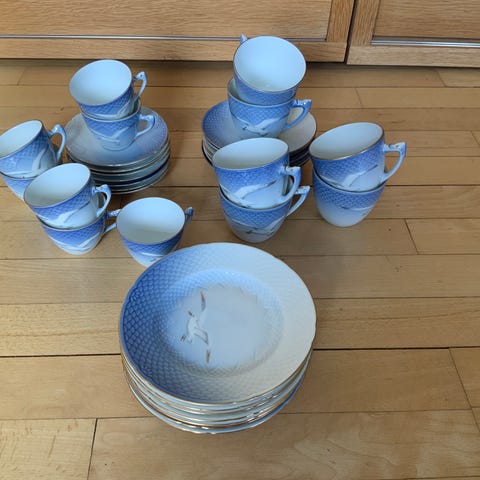 Royal Copenhagen Måge tallerken i porcelæn. Tallerkenen har blå-hvid dekoration med mågemotiv og skælrelief langs kanten. Velegnet som middagstallerken eller serveringstallerken i stellet Måge fra Royal Copenhagen. Flot stand med guldkant, har aldrig været i opvaskemaskinen. 8 stk