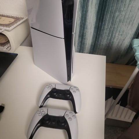 Sony Playstation 5 konsol i hvid med indbygget diskdrev. Konsollen leveres med to DualSense controllere i hvid og rød/sort. På billederne ses desuden en ladestation/holder til konsol og controllere samt et spil og en skærm, som eventuelt kan indgå efter aftale. Velegnet til gaming i høj opløsning og med understøttelse af moderne Playstation 5 titler.