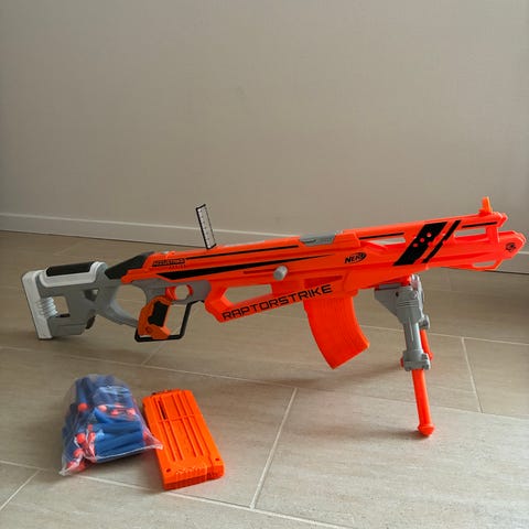 To Nerf pistoler og to af andet mærke, men som bruger samme petroner.