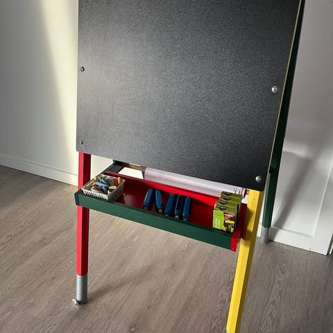 Fin tavle med kanter i aluminium. Det er en kridt-tavle på den ene side og kan fungere som opslagstavle på den anden side. Jeg har stort set kun brugt opslagstavle-siden, så kridt-siden er i meget fin stand. Tavlen måler 90 x 60 cm - og har huller til montering.