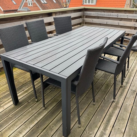 Havebord m/6 tilhørende stole + 1 ekstra stol i grå polyrattan.