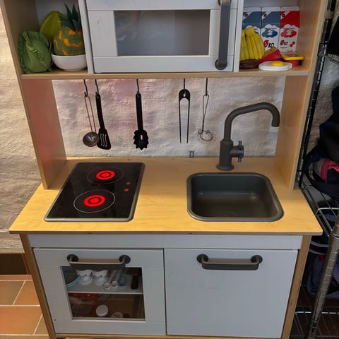 IKEA legekøkken i træ med vask og kogeplader. Legekøkkenet har bordplade med indbygget vask og vandhane samt to kogeplader. Under bordpladen er der skabslåger, heraf én med vindue. Øverst er der hylde og et lille overskab med låge. Egnet til leg i børneværelse eller legeområde indendørs.