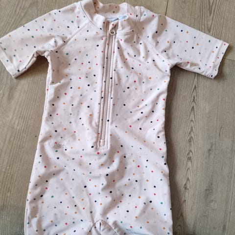 Badetøj, Badedragt, Liewood, str. 68, Sød UV-badedragt med prikker. Størrelsen hedder 68/74, men umiddelbart til den lille side. Badehat i samme farve med beskyttelse i nakke og skygge for øjne.