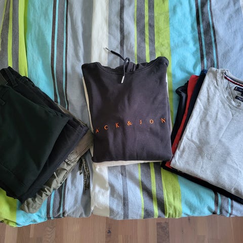 Tøjet er pænt og uden huller (2 trøjer og rød fodbold trøje har lidt brugsspor). Ellers står resten flot.