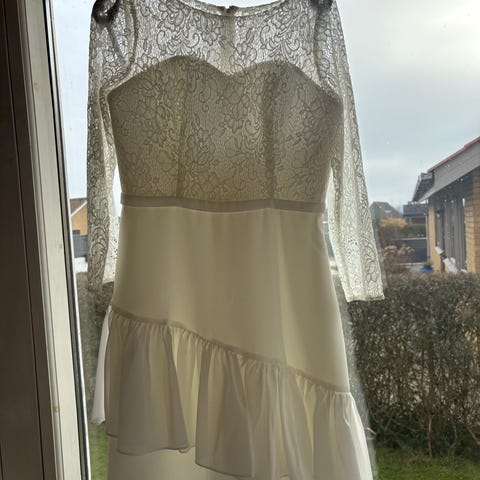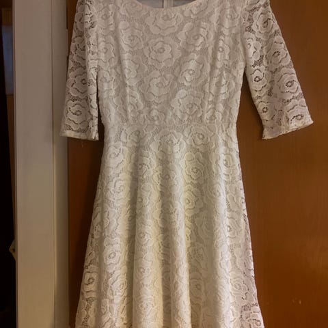 Luxux Delux kjole til særlige lejligheder i hvid polyester i størrelse 34. Kjolen har blondeoverdel med lange ærmer og rund halsudskæring. Overdelen er detaljeret med blonder, mens nederdelen består af flere lag stof med let fald. Lukning bagpå med knapper. Velegnet til formelle anledninger og festbrug. Konfirmationskjole af mærket LUXUX STR 34
