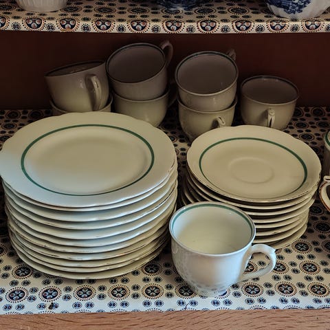 19 dele af stellet Sapphire fra slut 60’erne. 5 kopper, 6 underkopper, 6 kagetallerkener, en sukkerskål m. låg og en mælkekande. Alt i fineste stand på nær et ærgerligt afslag på knoppen af sukkerskålens låg (se foto).