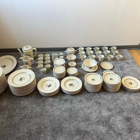 Så tretten smukke dele fra Royal Copenhagen udgået model - stellet med den kantede form og de fine borter, diskret kantet med rød/grå.