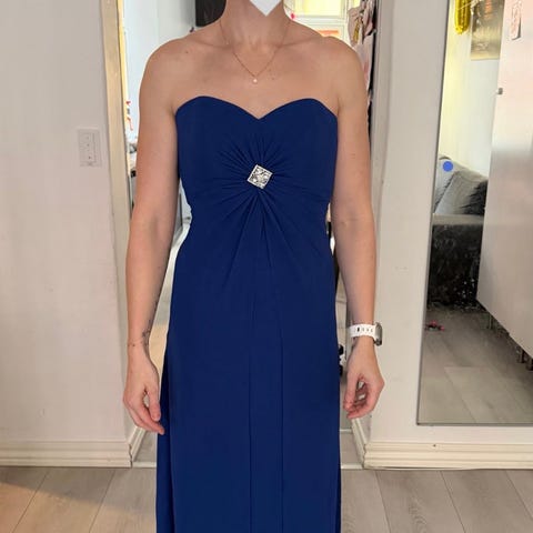 Godske kjole i str. 48. Kjolen er blå og fremstillet i polyester. Modellen har korte, let transparente ærmer og et enkelt, lige snit. Egnet som damekjole til både hverdag og mere formelle anledninger.