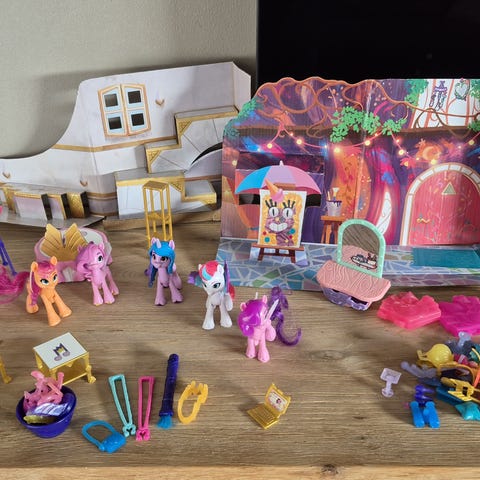 My Little Pony legetøjssæt med lille ponyfigur og krybbe. Sættet består af en lyserød pony med ble og hårpynt samt en foldbar krybbe/legeplads i pastelfarver. Der medfølger små tilbehørsdele som fx flaske, bamse og andre småting til rolleleg. Egnet til børns fantasi- og rolleleg med My Little Pony-universet.
