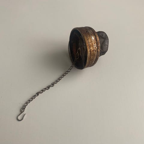 Meget sød forgyldt te si med lille fad, som kan bruges i tekande eller i en kop.