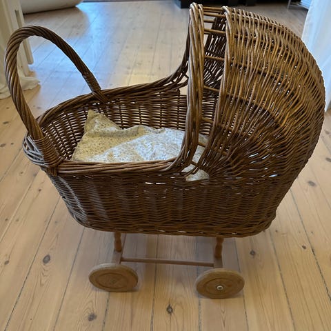 Dukkevogn/barnevogn i rattan/flet. Brugt meget lidt og fremstår i rigtig god stand. Madras medfølger ikke.