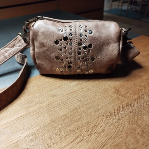Tasken har følgende mål: Bredde: 27 cm, højde 30 cm, dybde: 10 cm. Mange lommer både udvendigt og indvendigt. Detaljer på siden i form af nitter. Skindet er meget blødt.