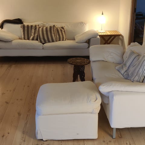 Sofagruppe, silke, 3 plus 2 personers sofa plus puf med løse ryg sidde og side puder.. ekslusivt design i gylden farve brokade stof i fin stand utrolig behagelig sidde komfort og puder holder facon ny pris for sæt 35000 kroner