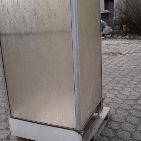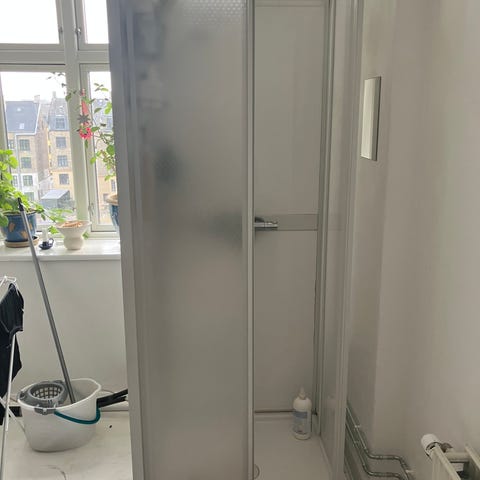 Brusekabine i hjørnemodel med buet front. Kabinen har glasvægge med aluminiumsprofiler og integreret brusearmatur med håndbruser og betjeningsgreb. Bundkar i lys plast/akryl med afløb. Egnet til montering i badeværelse, hvor der ønskes en lukket bruseløsning med skydedøre og faste vægge. Den har været brugt i forbindelse med renovering. Måler 90cm x 90 cm.. der kan godt være mulighed for levering