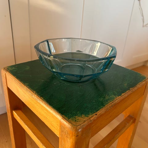 Vintage skål i blåt glas.H 9 cm, B 16 cm.Flot og velholdt, uden skår eller revner. Gå til varen, for flere billeder.(A6).