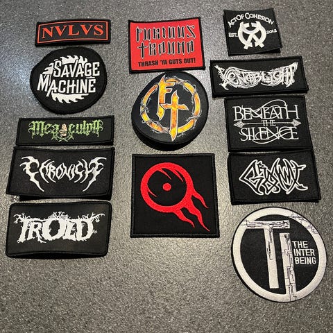 Sæt med stofmærker med motiver fra Black Sabbath, AC/DC, Motörhead og Motorpsycho. Mærkerne er beregnet til påsyning på tøj, tasker eller andre tekstiler. Leveres samlet i en pose, størrelserne fremgår omtrent af målebåndet på billedet. Velegnet til brug på jakker, veste eller rygsække.