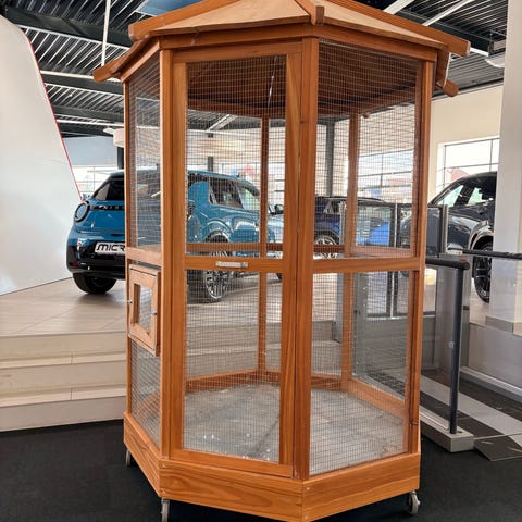Voliere anlæg: Brugt og pænt voliere anlæg på 60 m2, kan laves i flere forskellige størrelser, anlægget er i galvaniseret stål som boltes sammen, bag vægge/side i alu. plader, har kun været brugt inden dørs til papegøjer. Alle rammer er 1 mtr. bred. Fabrikat Haakon Voliere. Der er 2 forskellige tråd tykkelser.