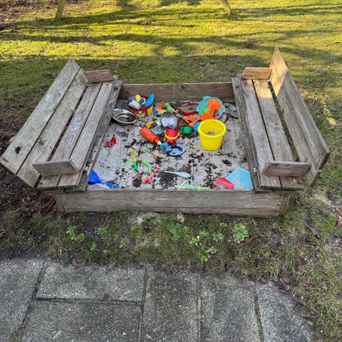 Skildpadde sandkasse i grøn (falmet i farven). Men har masser af timers leg endnu.