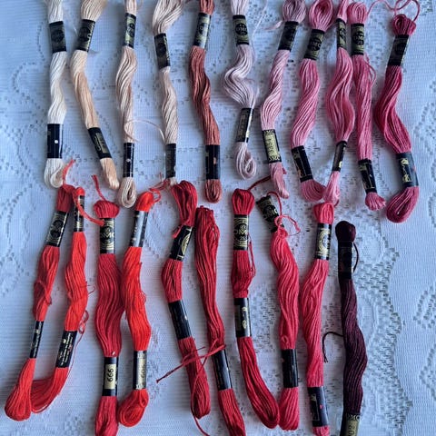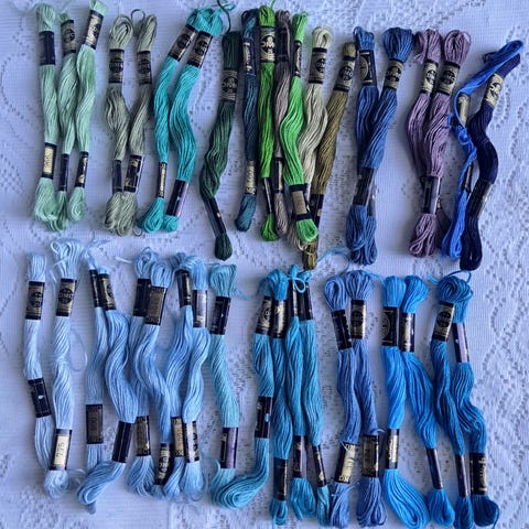 42 dukker dmc broderigarn i forskellige hvide, grå og brune nuancer, nogen farvekoder er der flere af og andre kun en enkelt.