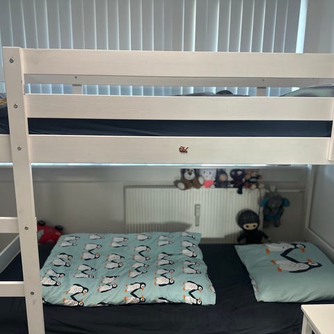 Emil køjeseng meget robust og også plads til siddehøjde til voksne i underkøjen der medfølger 2 madrasser 2000kr kan sende flere billeder ved interesse